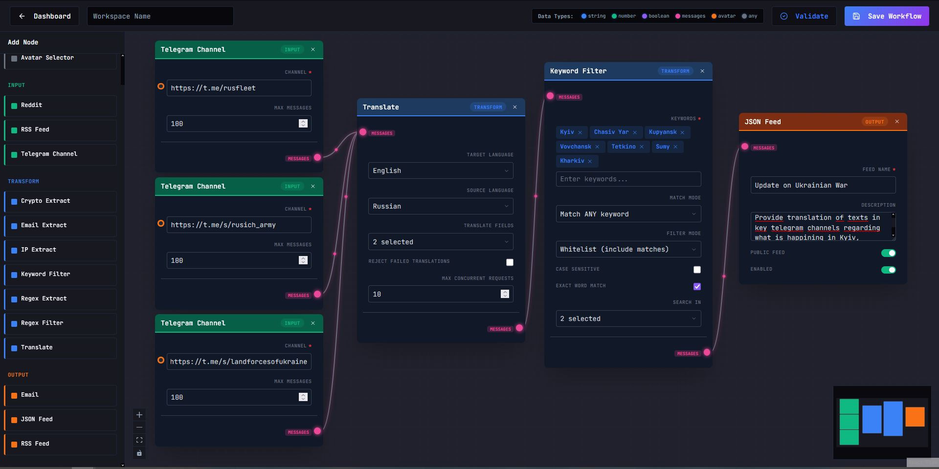 HubFeed is infrastructure purpose-built for CTI collection. Visual pipeline builder for OSINT and CTI analysts. We handle the fragile parts: API maintenance, parsing logic, delivery reliability.